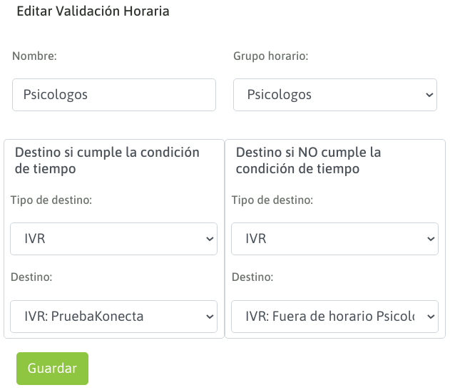 Para generar un elemento condicional de tiempo, se debe acceder al menú Telefonía -> Validaciones horarias.