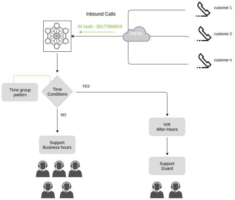 En ésta sección, se trabaja con el concepto de Enrutamiento de llamadas entrantes condicionado por rango de tiempo, para configurar el flujo de llamadas entrantes hacia diferentes destinos internos, a partir de comparar la fecha/hora en que llega una llamada y un patrón (de fechas y horas) relacionado, de manera tal que se pueda planificar de antemano si una llamada debe ir hacia un destino u otro de acuerdo al resultado de dicha comparación.