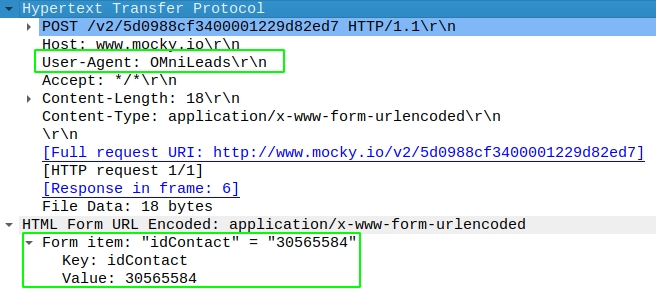 Como podemos observar el campo «User-Agent» debe llegar como «OMniLeads», y en el cuerpo del POST, el número de identificación ingresado en la llamada se envía como «idContact».