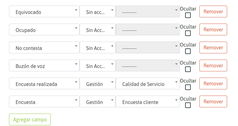 En la segunda pantalla se deben asignar las calificaciones que se requieran para que los agentes puedan clasificar cada llamada realizada al contacto.