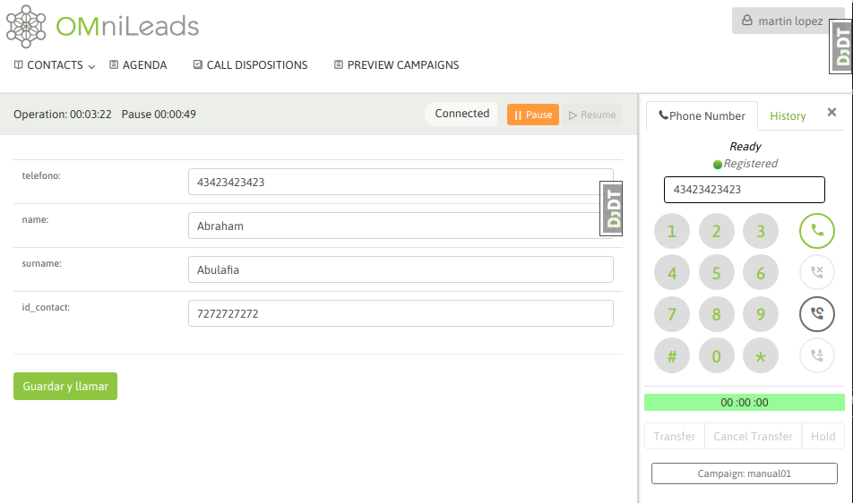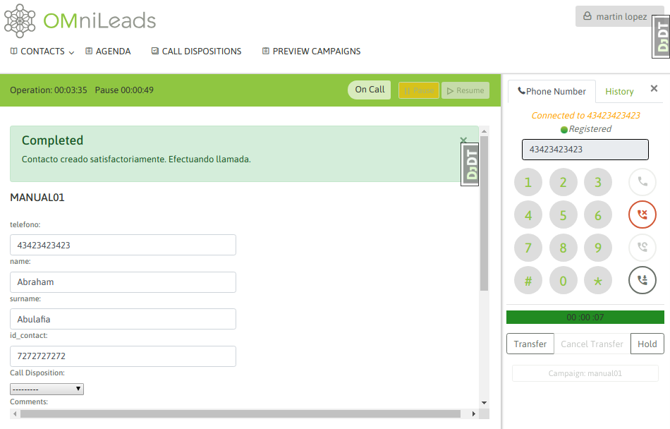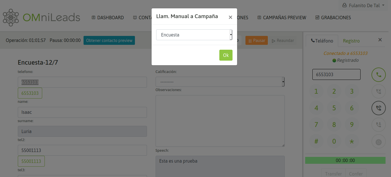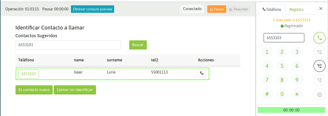 Cuando un agente se encuentra online y marca un teléfono correspondiente a un contacto de la base de la campaña, el contacto cuyo teléfono coincide con el teléfono marcado por el agente, es desplegado como contacto a seleccionar y así despliega sus datos en la pantalla de agente. También se permite generar un nuevo contacto. Entonces, el agente puede, o bien confirmar que la llamada se dispara hacia el contacto listado, o bien crear un nuevo contacto y marcarlo. Los datos (extras al teléfono) del contacto son desplegados en la pantalla de agente:
