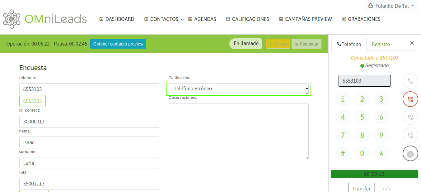 Por lo tanto, el agente puede intentar contactar a todos los números disponibles como «link» en la ficha del contacto, hasta finalmente calificar y pasar a uno nuevo.