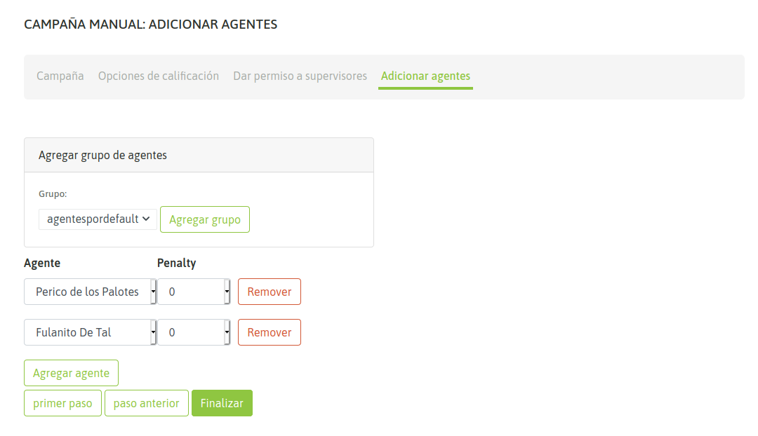 En los siguientes pasos, se pueden añadir supervisores y agentes a nuestra campaña: