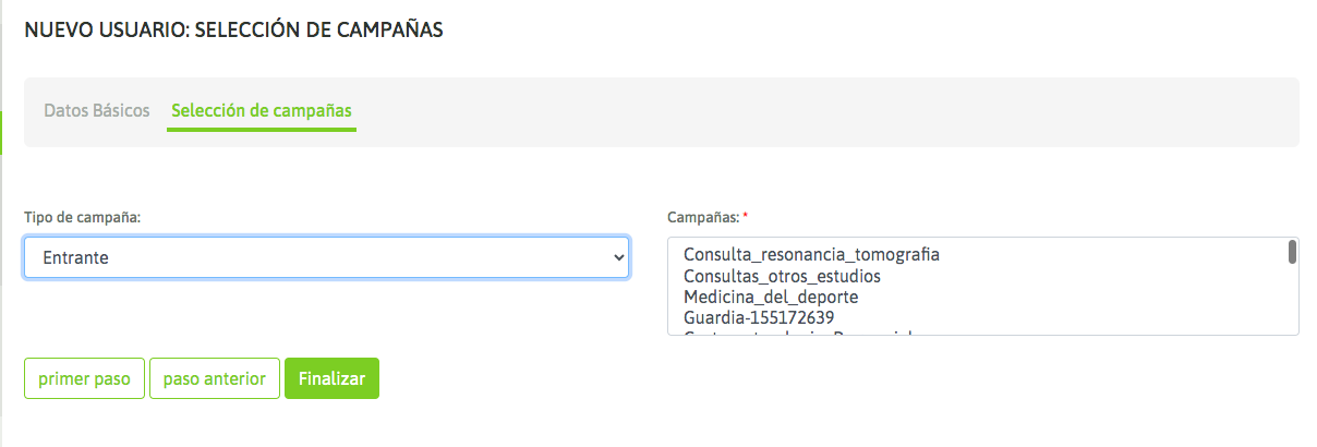 Avanzando en el Wizard, se procede a la Selección de Campañas, donde la vista permite seleccionar (por Tipo) las campañas a las que se asociará el usuario creado. De esta manera, al clickear en Finalizar, el usuario queda apto para operar en la plataforma: