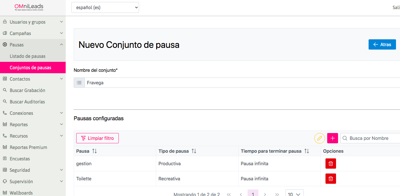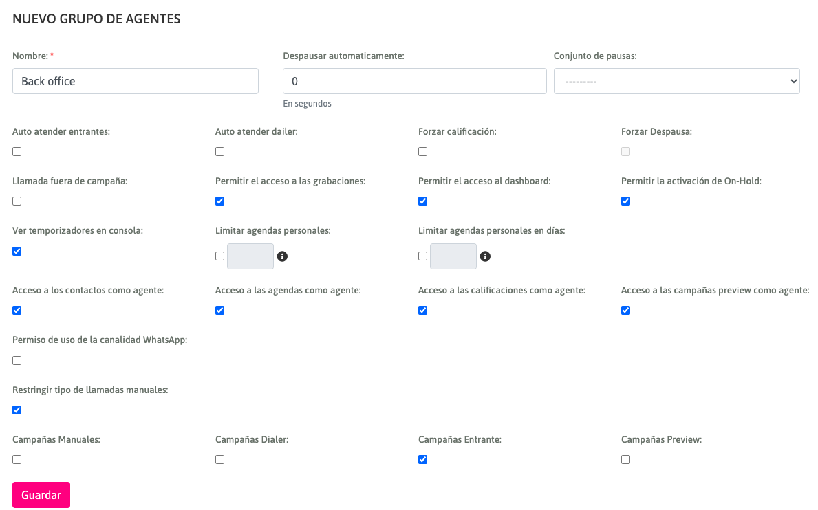 Conjunto de pausas: Aquí se presenta la posibilidad de asignar un grupo de pausas (previamente creado) al grupo de agentes, para que así los agentes que formen parte de dicho grupo, no visualicen todas las pausas, sino únicamente aquellas que forman parte del grupo de pausas asignado.