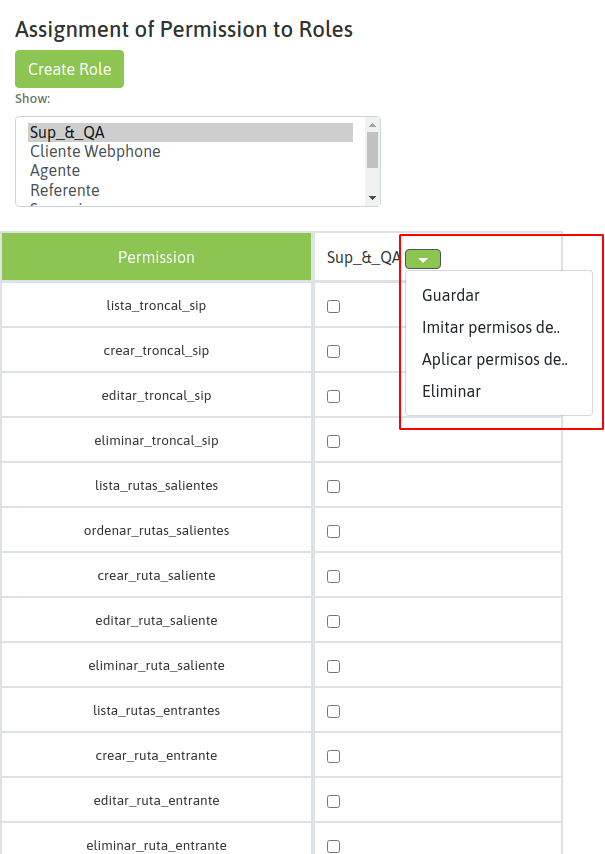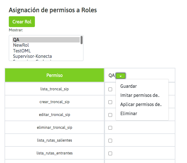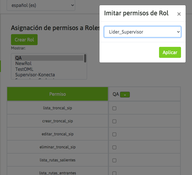Desde el combo de opciones del nuevo rol creado, se puede imitar permisos de otro rol ya existente, o bien aplicar permisos de otro rol ya existente. La diferencia radica en que la primer opción pone los mismos permisos del rol existente, mientras que la segunda opción suma los permisos del rol existente, a los permisos que ya han sido seleccionados en el nuevo rol.