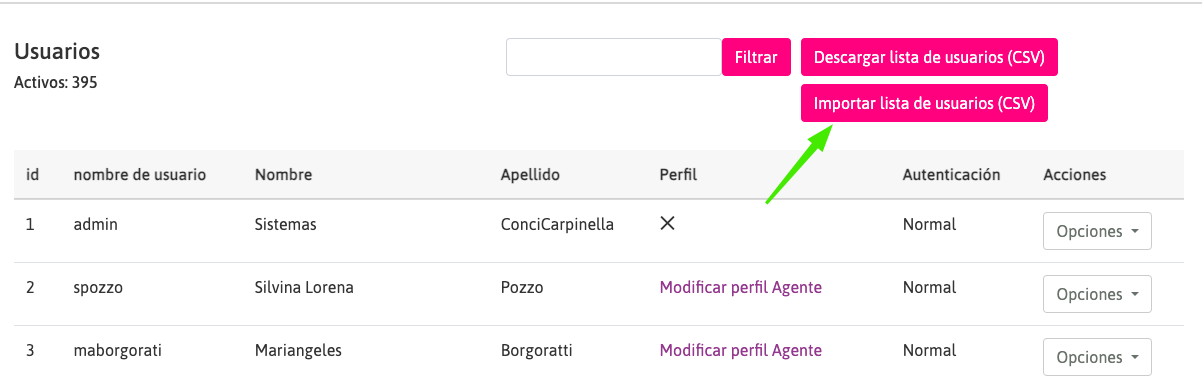 Nota: El botón de "Descargar Lista de usuarios (CSV)" ya ofrece dicha estructura. Ésto facilita procesos de importación/exportación futuros.