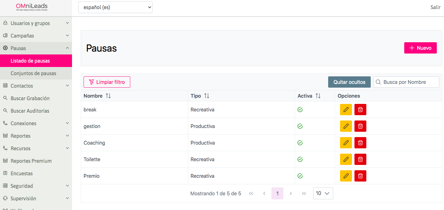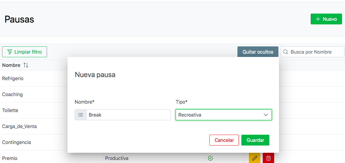 Las pausas las pueden generar los usuarios con dicho permiso, y pueden ser del tipo «Recreativas» o «Productivas».