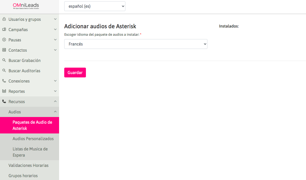 Si la instancia precisa utilizar otros idiomas, se pueden instalar los mismos a través de la sección Recursos -> Audios -> Paquetes de Audio de Asterisk, en donde se podrán adicionar nuevos idiomas.