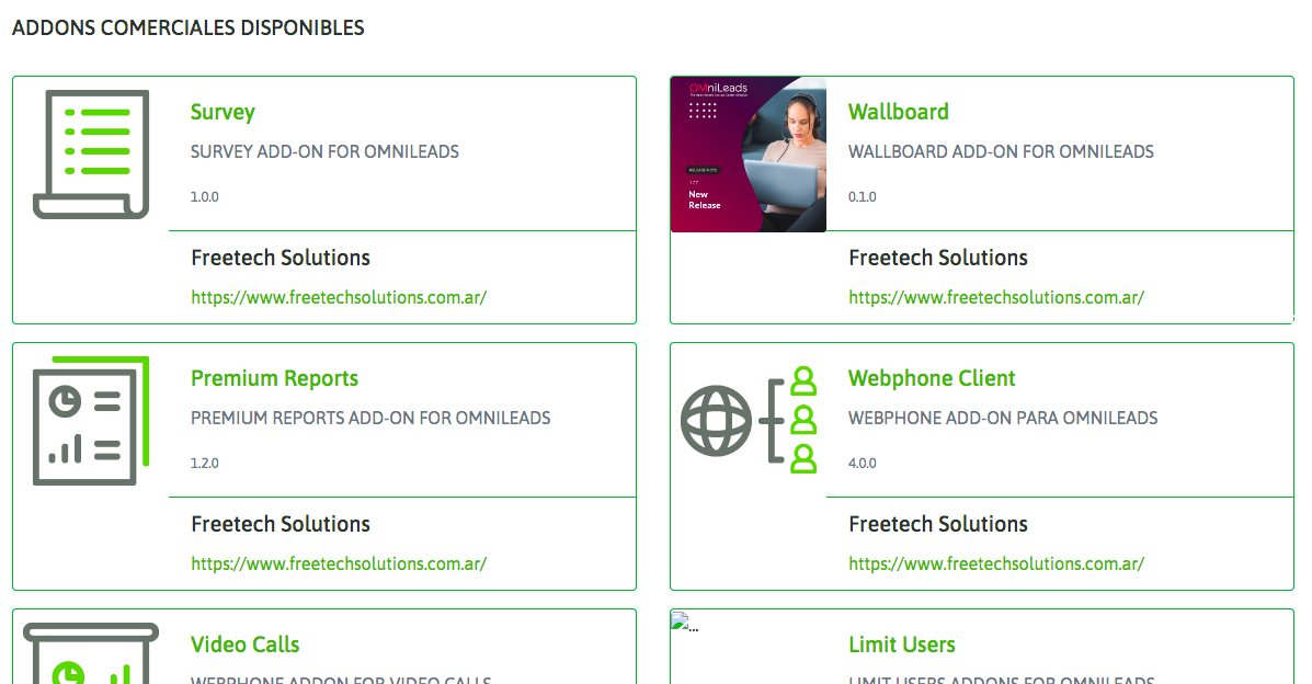 El sistema brinda información sobre los addons comerciales disponibles en la versión de OMniLeads Enterprise, a través del menú Ayuda -> Market place: