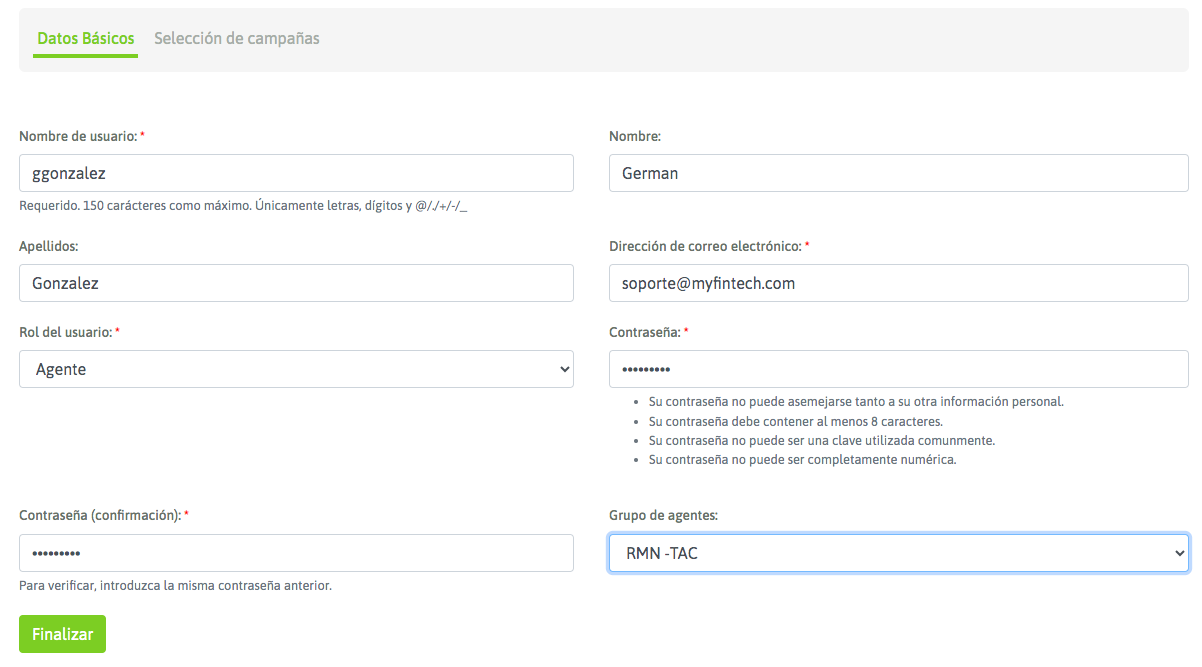Antes de crear un usuario Agente, debe existir al menos un Grupo de agentes.