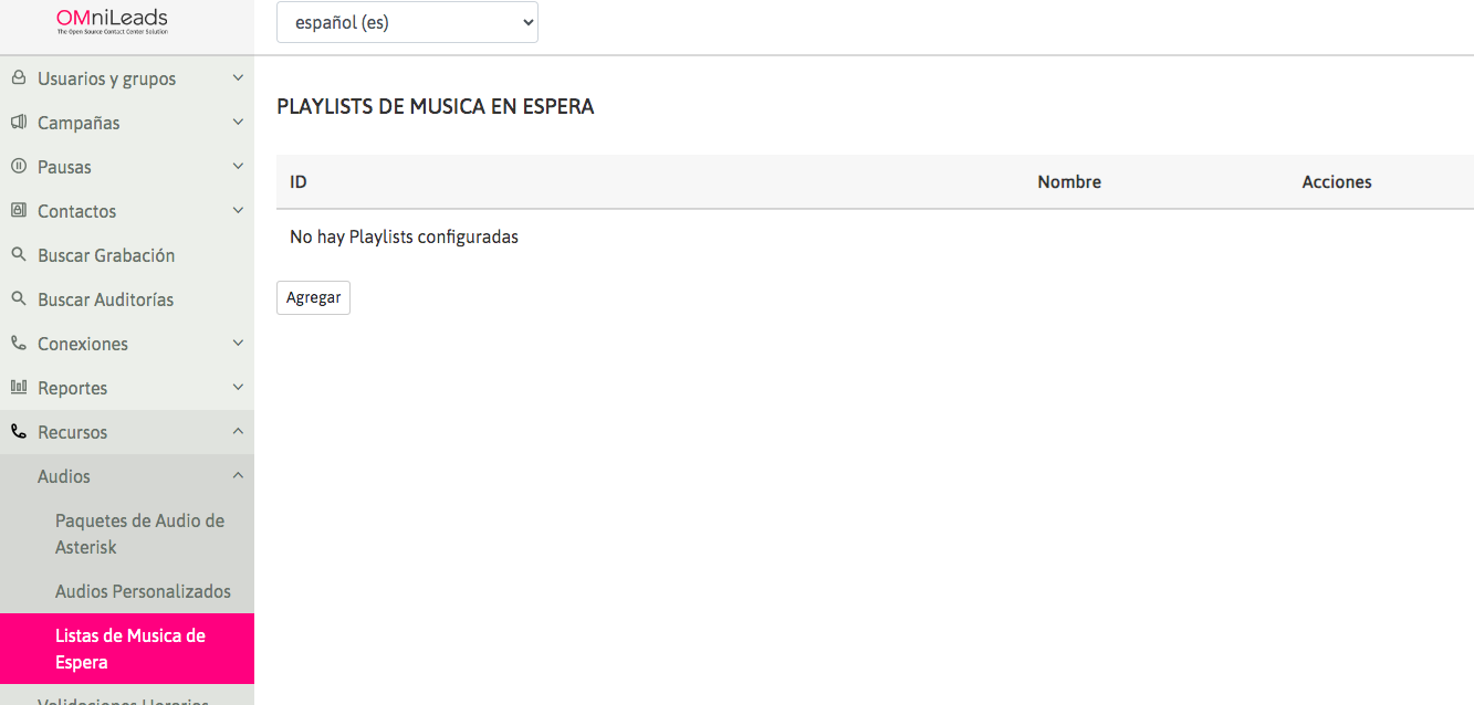Dentro del módulo Recursos -> Audios -> Listas de Música de espera, se permite gestionar listas de reproducción con archivos en el formato wav 16 bits. Las listas aquí generadas, podrán ser utilizadas en las campañas entrantes a la hora de poner a los llamantes en cola de espera. Cabe destacar, que no podrán eliminarse playlists que estén en uso por alguna campaña o que tengan archivos asignados.