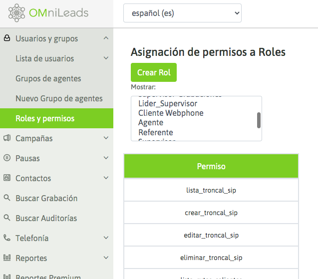 Referente: Los usuarios generados y asignados a éste rol, podrán sólo listar todas las campañas, consultar reportes generales de agentes y llamadas, acceder a la supervisión de agentes y campañas.