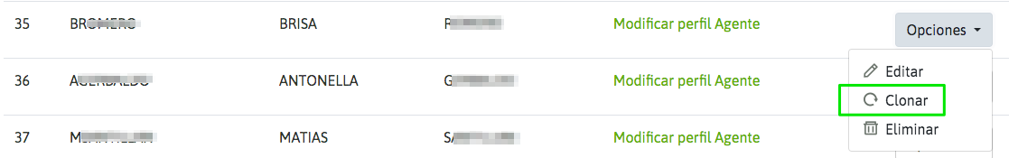 Para lograr agilidad a la hora de crear recursos en el sistema, la vista de Usuarios permite clonar agentes conservando tanto sus campañas asignadas como su configuración de grupo.