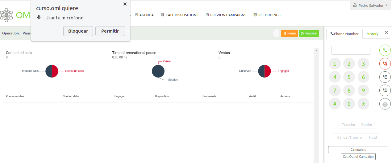 Una vez que accedemos con nuestro agente, si todo va bien, se desplegará un popup que solicita el permiso para tomar control del micrófono: