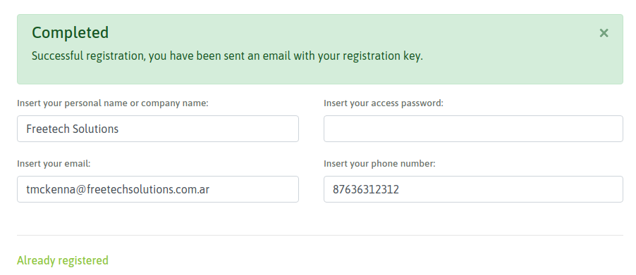 Es importante tener en cuenta que si quiere registrar varias instancias con una misma dirección de e-mail, debe ingresar también la misma contraseña. En otro caso, use una dirección de e-mail diferente.