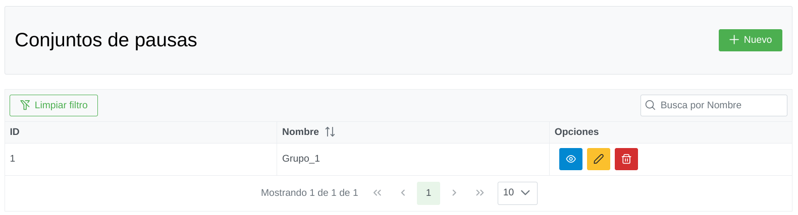 Para generar un conjunto de pausas, se debe acceder al menú Pausas -> Conjuntos de pausas -> Nuevo: