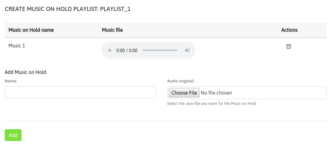 Una vez creada una nueva lista, deberán agregarse las músicas deseadas, a través de archivos en formato .wav a cargarse desde su computadora. Sólo estarán disponibles para su uso en campañas entrantes las playlists que tengan al menos una música cargada.