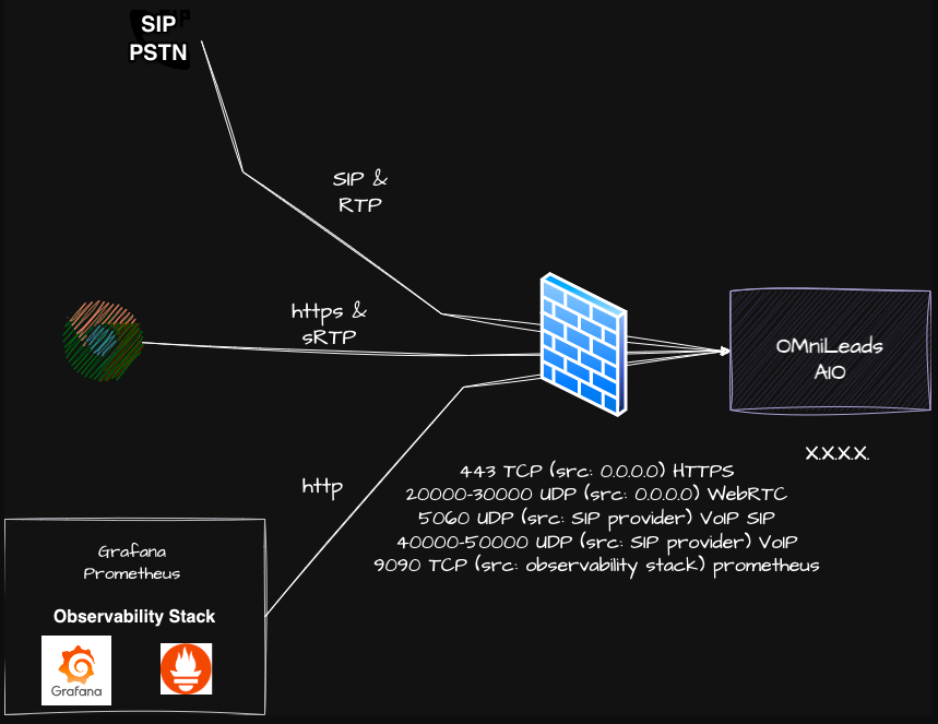 En caso de necesitar exponer los puertos VoIP a TODO Internet, se recomienda administrar la seguridad VoIP utilizando un Session Border Controller o un Asterisk ó Freeswitch configurado como componente SIP de borde, de manera tal que OMniLeads no quede expuesto a todas las direcciones IPs. Cómo mínimo, comenzará a recibir basura SIP proveniente de múltiples orígenes.