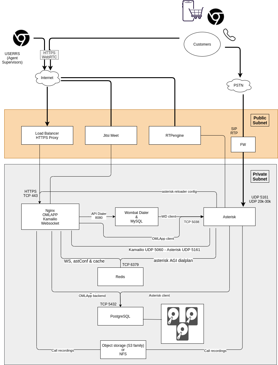 Idealmente, se recomienda desplegar OMniLeads junto a un HTTP Proxy o Cloud Load Balancer de borde para las peticiones HTTPS y un Session Border Controller para la gestión de borde VoIP. Ésto robustece ampliamente la seguridad de su desplgiegue.