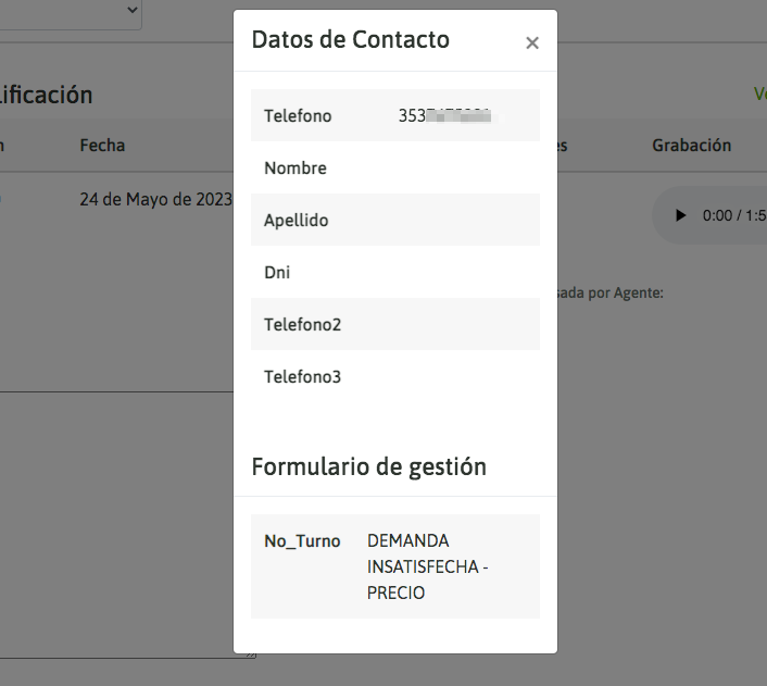 Observed operation: The auditor detects by analysing the recordings, contact details and fields completed in the operation form that the operation has been successful, but sends it back to the agent (with the relevant explanation) so that he can carry out the operation again and call the contact again.