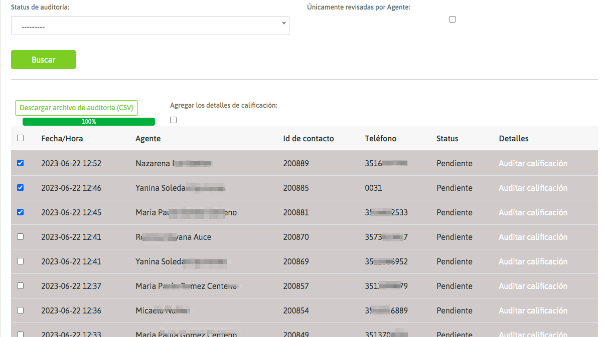 The first thing to clarify is that only records with a management rating (Campaigns, ratings and forms) will be sent to the audit module. This is where auditors can then work on each "pending" record, as well as download the selected interactions to CSV at will: