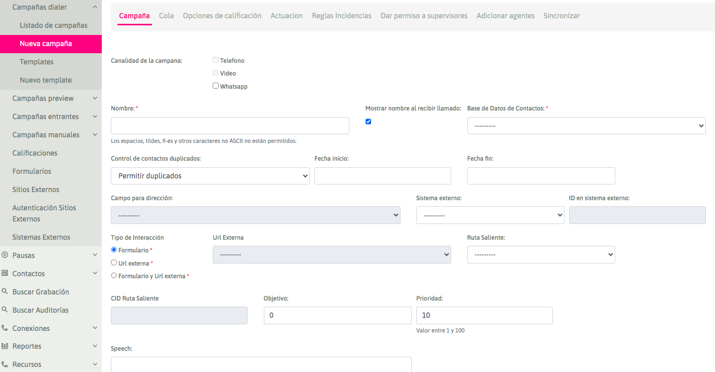 Interaction Type: Indicates whether the campaign will operate with OMniLeads forms, invocation to a CRM (External URL) for each connected call, or both methods simultaneously.