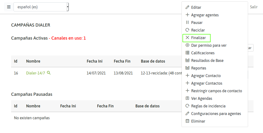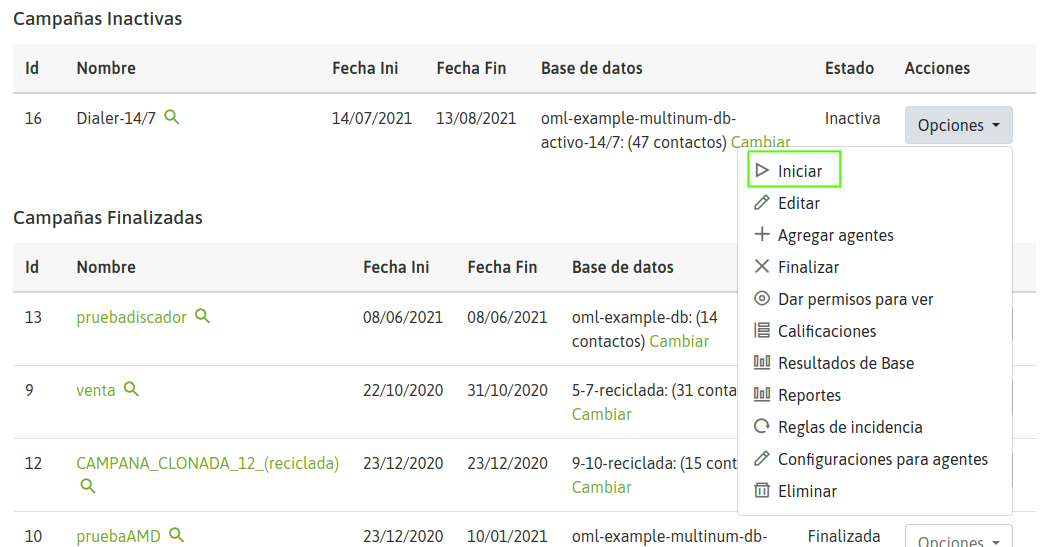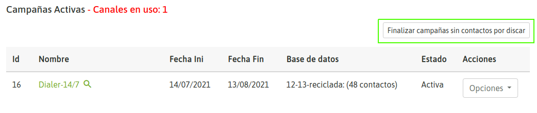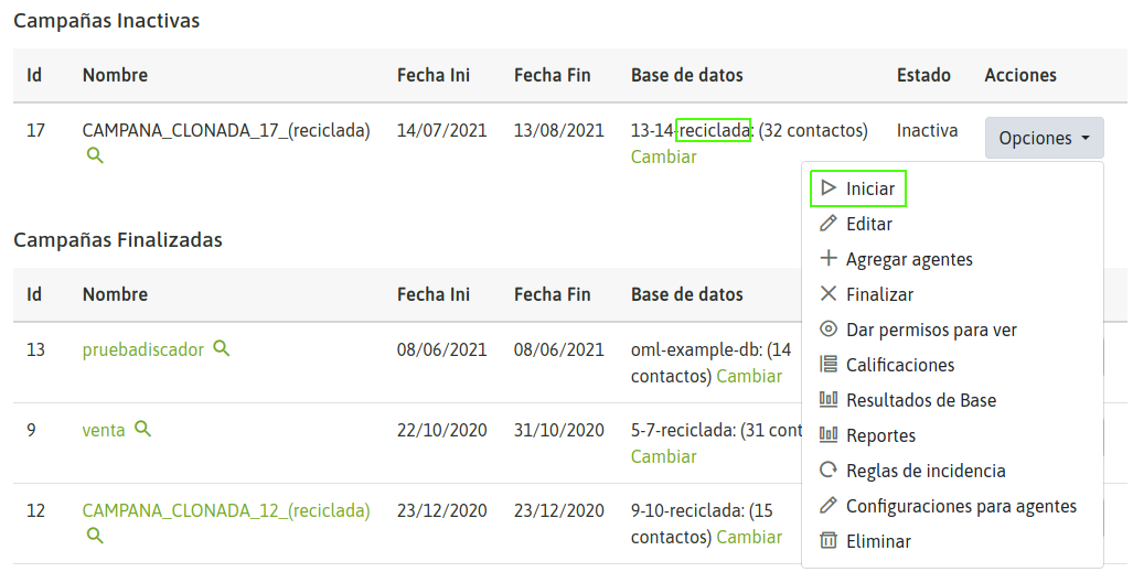 When executing the recycling, the campaign is in the "Inactive" state, therefore it remains to activate it so that the recycled contacts begin to be marked by the dialer: