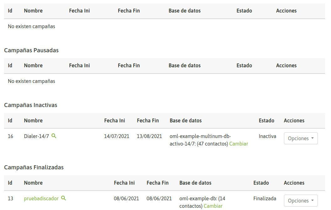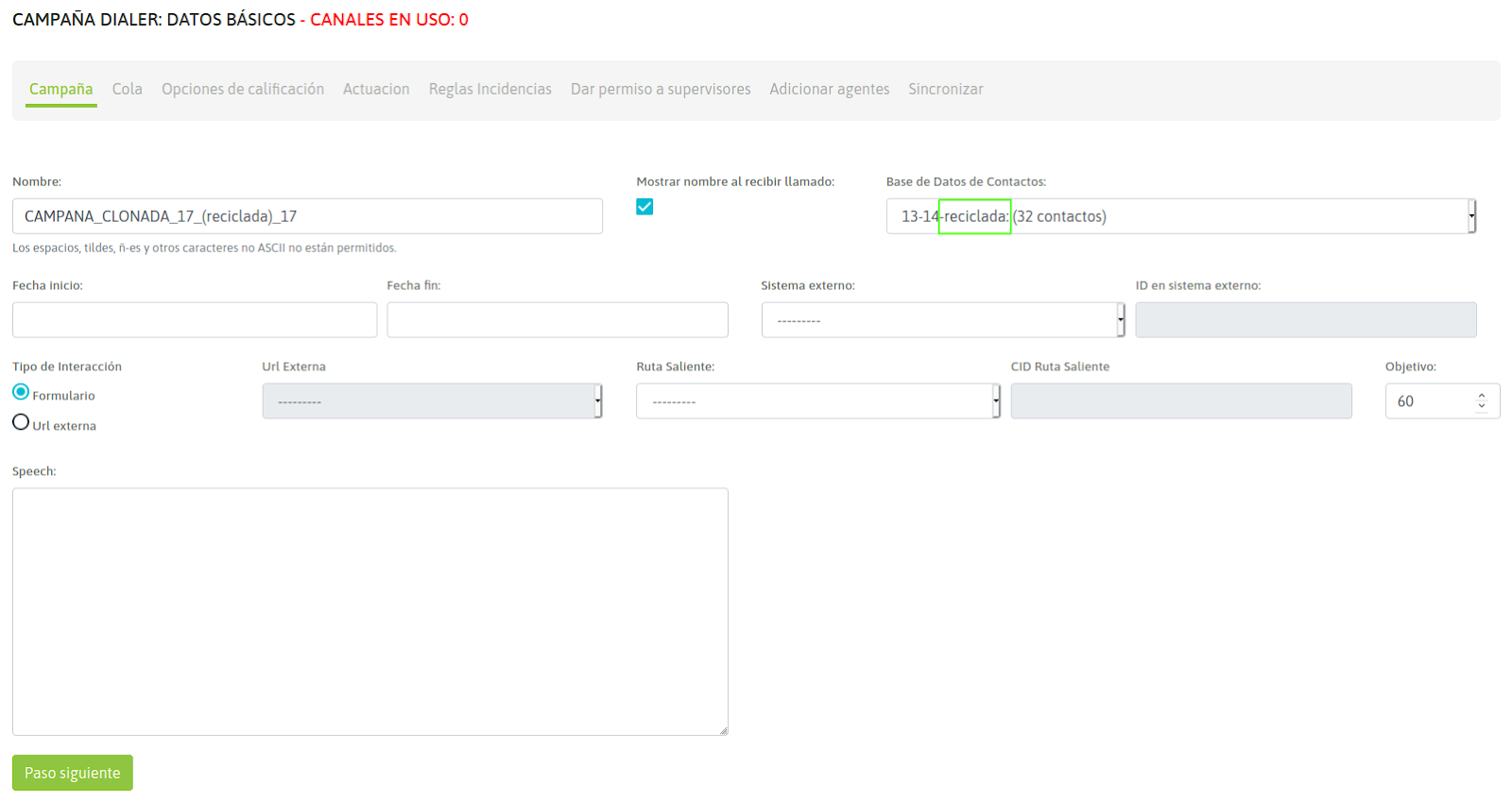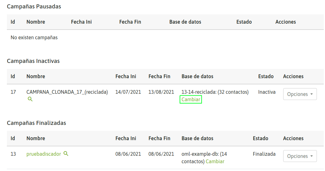 This allows you to continue operating with the same campaign but renew the source of contacts to be called. In this way, the history of reports, recordings and other statistics in the same campaign is followed. To carry out a database change, the campaign must be paused or in the “finished” status.