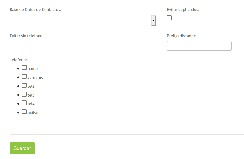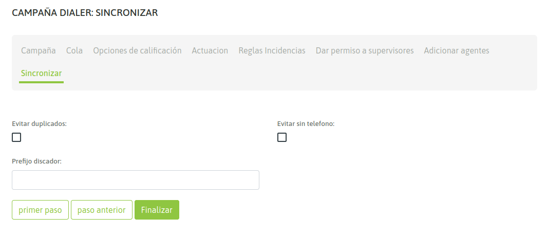 Figure 8: Campaign Parameters - Synchronize In this step, you simply indicate 3 options: Avoid duplicates: Select this option to avoid uploading to the dialer records with a duplicate primary phone number. Avoid without phone: Select this option to avoid uploading to the dialer records from the contact database that do not have a primary phone number. Dialer prefix: This field is used to indicate to the dialer whether it should add a prefix before each number in the contact database when dialing each call in the campaign. Finally, we click on the "Finish" button to finalize the creation of our campaign.