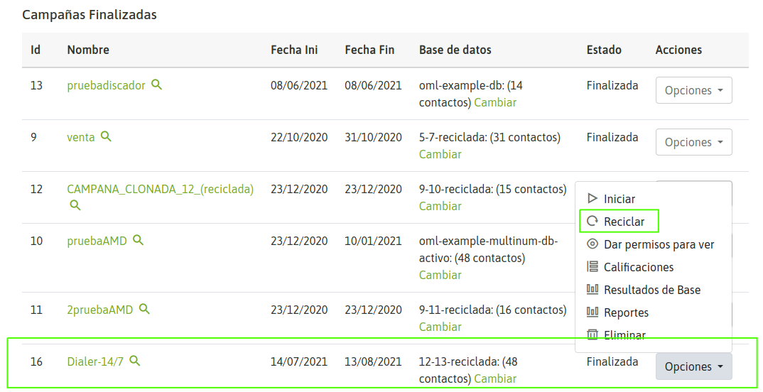 This option allows the administrator to select contacts from the database with certain ratings made by agents (on connected calls) as well as ratings made by the dialer (on uncontacted calls -busy, no answer, voicemail, etc.-), when forming a criterion to recycle the contact database of the current campaign, so that the dialer calls back the contacts that fall within the ratings indicated in the recycling. To recycle a finished campaign, we must display the «Options» menu of the campaign, and select «Recycle», as shown in the following figure:
