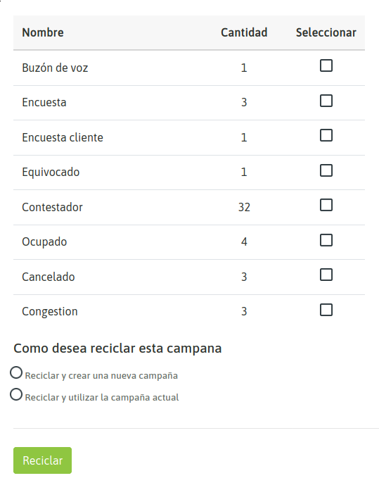Recycle on a new clone campaign: Re-mark the selected contacts, but on a new campaign similar to the original, and whose contact base will be the result of the recycling.