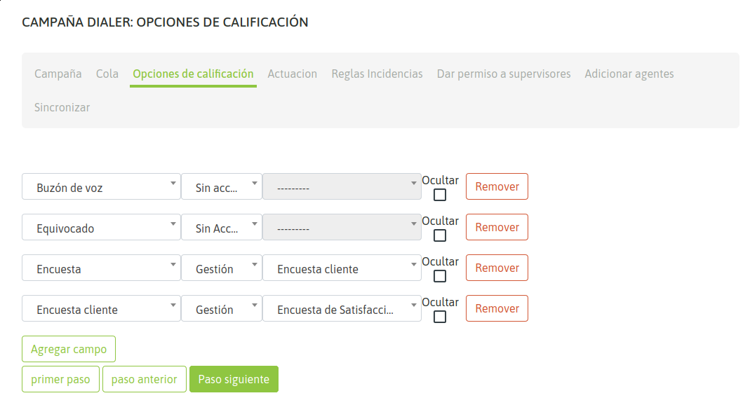 After completing all the fields, you must press the "Next Step" button. On the next screen, you configure the rating options, selecting one by one from the drop-down menu the ratings that will be used for the calls within the campaign. In addition, you must indicate whether it is a "Management" rating (the one that triggers the campaign form) or a "No Action" rating that simply classifies the contact. IMPORTANT: You cannot change the Management Form previously selected in the Rating Options Wizard if the Management Rating has already been used in the campaign.