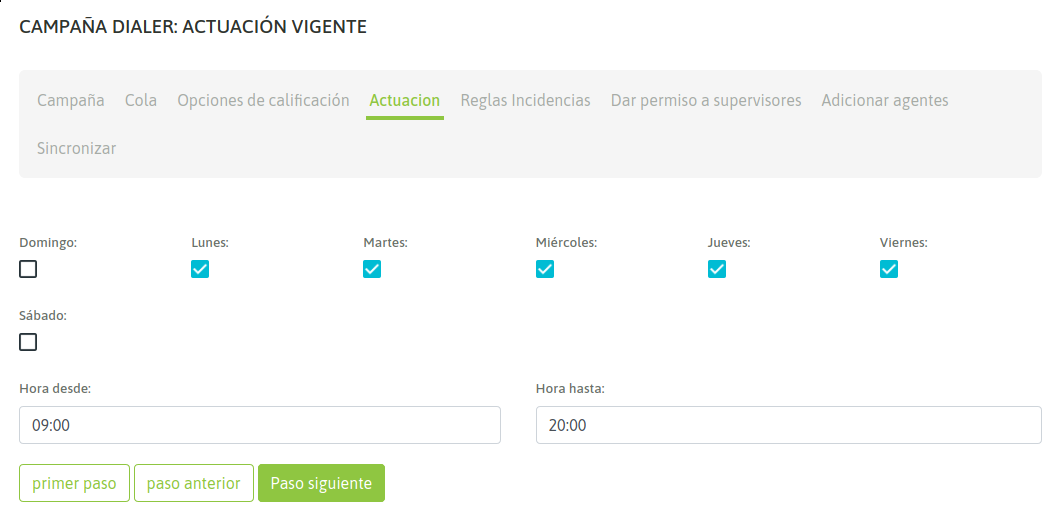 Figure 4: Campaign parameters - Days and hours Click on "Next step", and in this case you work with the "incidence rules", that is, under which conditions you will try to contact numbers that were Busy, Answering, No Answer, Temporarily out of coverage, etc.:
