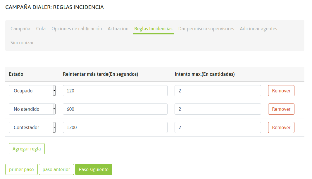 Figure 5: Campaign parameters - Incident rules As can be seen in the figure above, the fields to be completed allow you to determine how many seconds the communication should be retried and how many times at most it should be attempted according to each status. The telephone statuses that can be automatically retried are: Busy. Answering machine detected. Destination does not answer. Call rejected (Rejected): When the call could not be placed due to problems inherent to the external telephone network. Timeout: When the call was contacted, connected, but no agent was free to handle it. Click on «Next step» to assign the campaign supervisors: