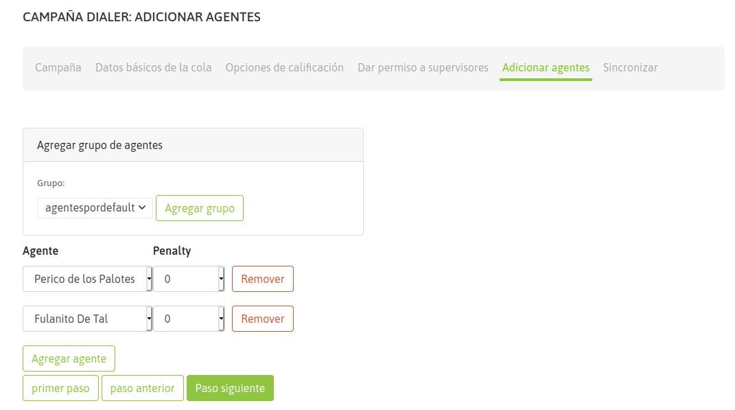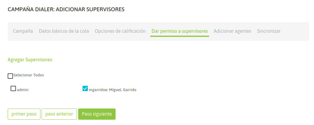 Figure 6: Campaign Parameters - Supervisors Click on «Next Step» to assign the campaign agents: