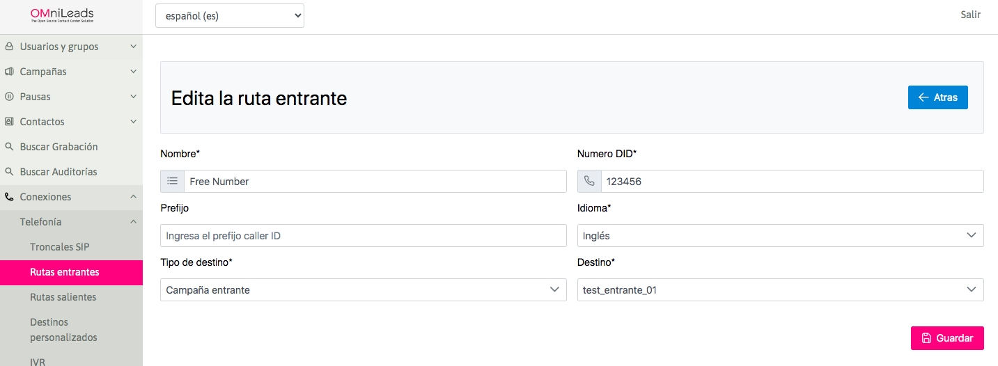Using the route with the DID 123456 as shown in the previous figure, the Asterisk PBX should generate calls through the SIP trunk to the mentioned number whenever any PBX resource needs to reach the 123456 destination of OMniLeads. _Figure 2: Incoming route parameters
