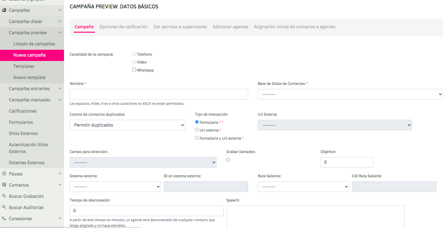Interaction type: Indicates whether the campaign will operate with OMniLeads forms, with the invocation to a CRM (External URL) for each connected call, or with both methods at the same time.