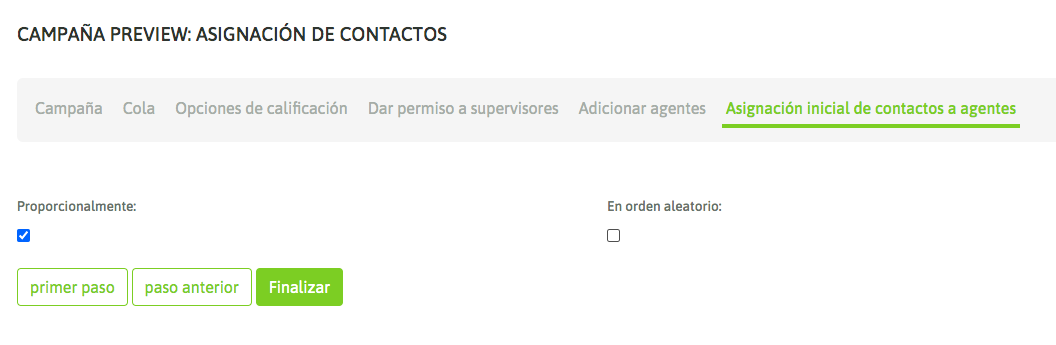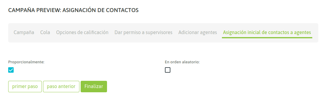 Finally, in the final stage of the wizard, it is optional to pre-assign contacts to agents. This pre-assignment can be done proportionally, by checking the "proportionally" option (the database records are divided among the agents in blocks of equal parts):