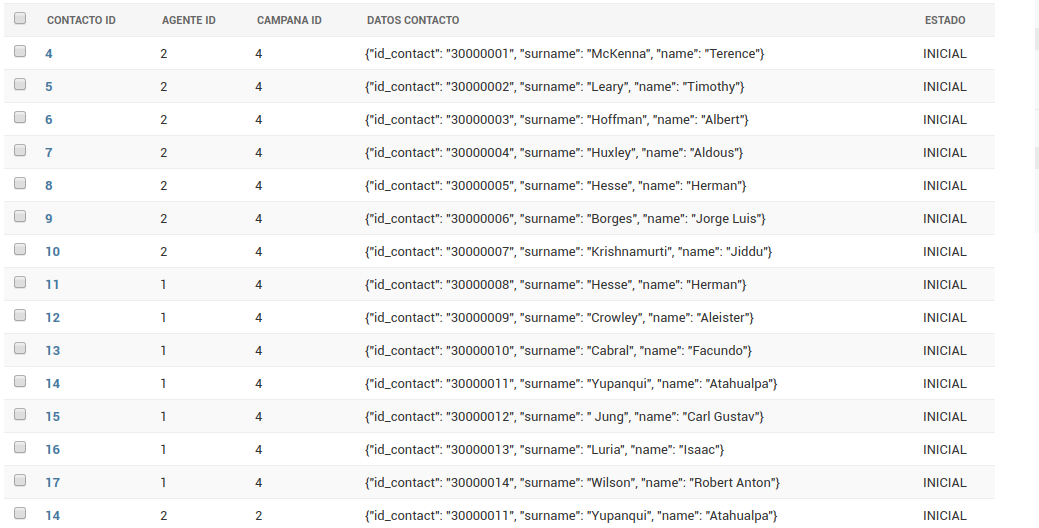 If the option to assign proportionally is selected, the system will perform an initial and equal allocation of contacts to each of the agents, allowing that in the agent console, when the agent requests a contact from the campaign, he will only be given free contacts or from the list of those that have been assigned to him. We can see an example of distribution using the Django administrative interface in the following figure: