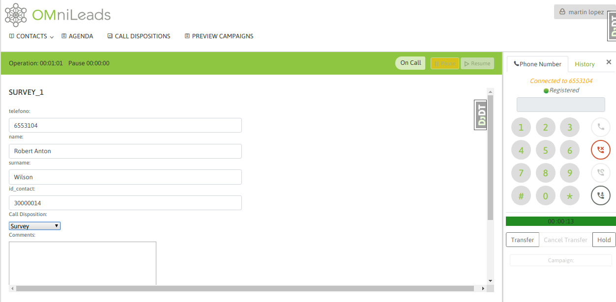 As we know, OMniLeads supports that each contact in a database has “n” contact phone numbers, so that if the contact is not found at its main number (the first one in our database CSV file), it can be contacted at the other numbers. In this case, each phone number (which we indicate in the database upload) is generated as a link within the contact data presented on the agent screen. Clicking on this link will trigger a call to the contact’s extra phone number. The following figure shows this scenario: