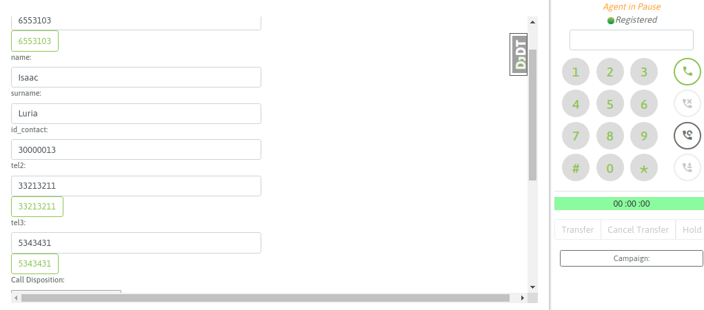 If the agent clicks on the phone, then the call is triggered, the data (extra to the phone) of the called contact is displayed in the agent view, allowing the agent to classify the call with one of the ratings assigned to the campaign: