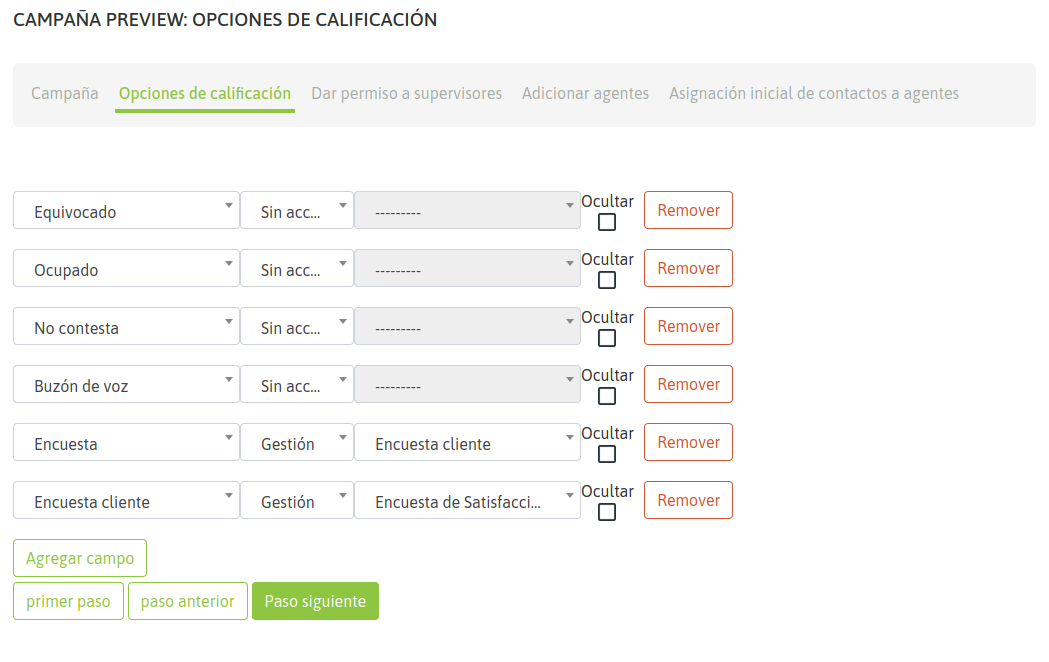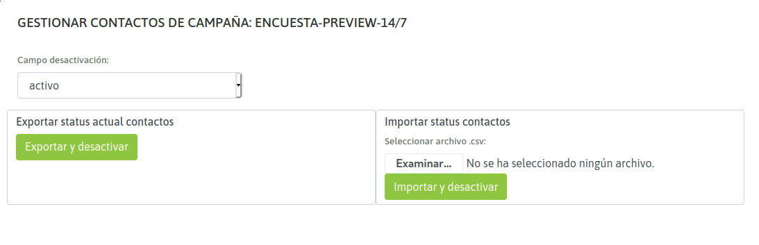 Important The field to be selected must be taken into account in the CSV format when importing the contact database before attaching it to the campaign. Adding or modifying column names in the CSV afterwards is not allowed. After exporting the current order of contacts, the deactivation column can be edited with the values 0 or FALSE, which, after importing the .csv file, will indicate to the system that these contacts should not be delivered to any agent. Any other value other than these causes the system to assume that the contact can be delivered.