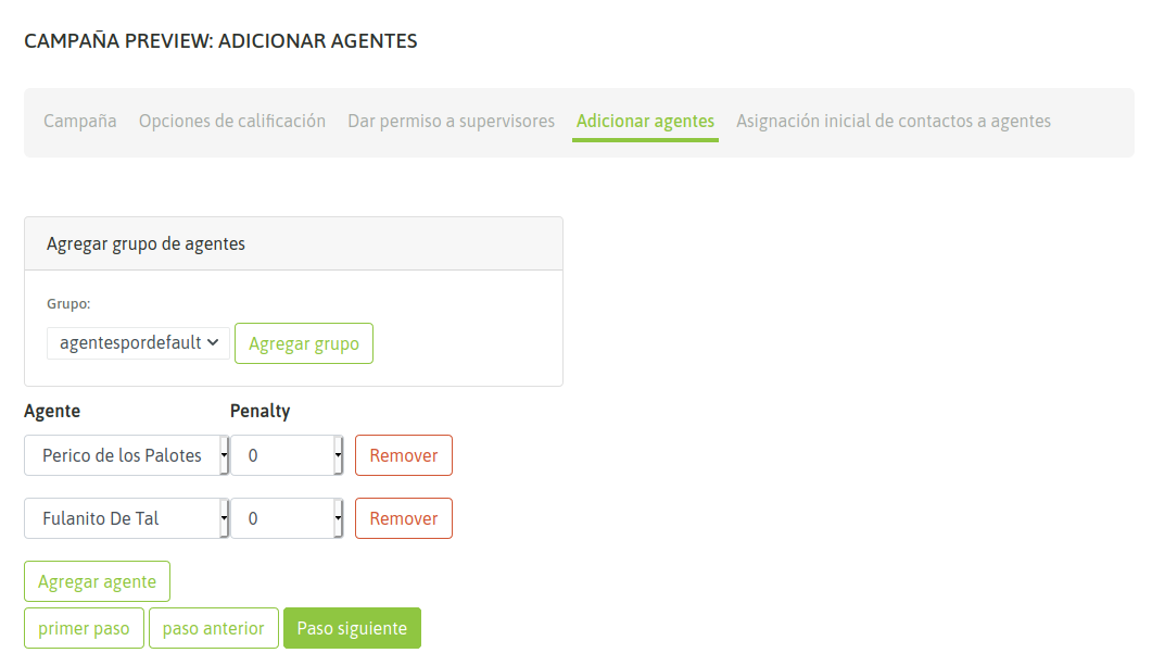 Next, it remains to assign the supervisors and agents who will be able to work on the campaign. The following 2 figures illustrate an assignment of agents to a campaign:
