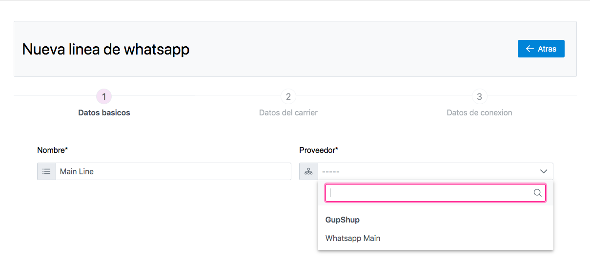 To register a Line, you must access the Connections Menu -> Whatsapp -> Lines and click on "+ (New)" to complete the wizard. The first section corresponds to the Basic Data: