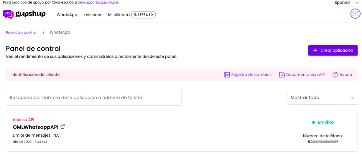 In the following figure, you can see an example of a GupShup account, whose "OMLWhatsappAPI" Application in Control Panel -> Whatsapp links the business Whatsapp number with the URL from which we will reach the OMniLeads instance that will receive/send messages.