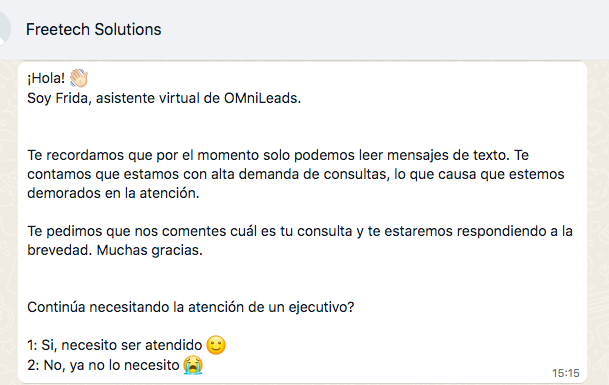 Interactive / Smart IVR: Every lead/prospect/customer who sends a message to the WhatsApp Business number within the configured Time Group will receive the automatic Welcome Message with Derivation Options. Depending on the option selected, they will be forwarded to the General Inbox of the destination campaign corresponding to the configuration. There, agents will be able to assist them from the WhatsApp Toolbar.
