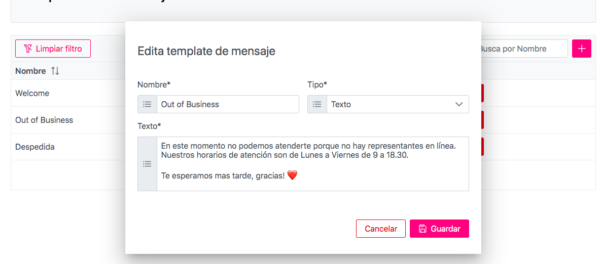 To correctly set up the WhatsApp channel, you must have a Time Group and a Message Template Group in advance. On the one hand, the time group will define the operating window in which OMniLeads will be able to receive messages and route them to the customer service agents. On the other hand, the template group will store a set of predefined messages that will serve as a "quick response" for the agents, with the aim of streamlining management.