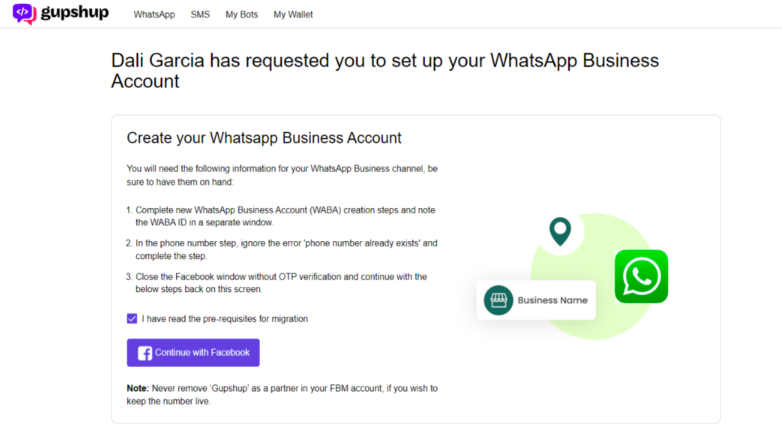 If you are not the Facebook Business Manager account administrator, GupShup provides an option to share the URL with the Account Administrator for authorization: