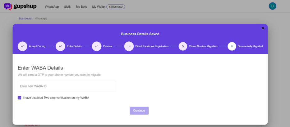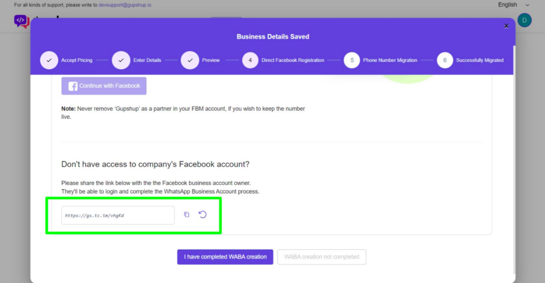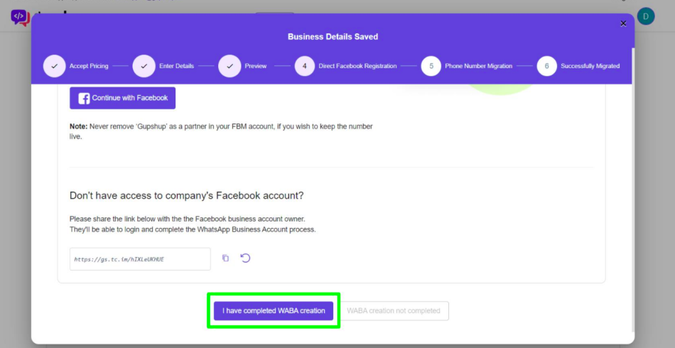 Step 7: Returning to GupShup, click on "I have completed the creation of WABA" and enter the WABA copied in the previous step: